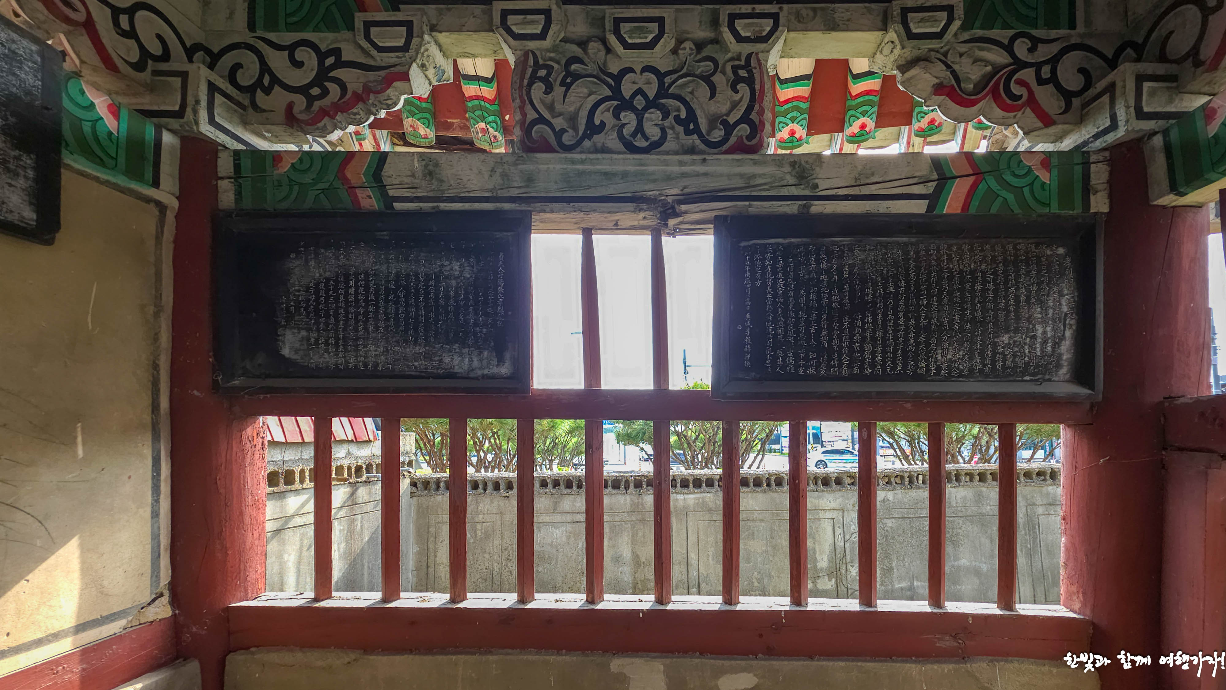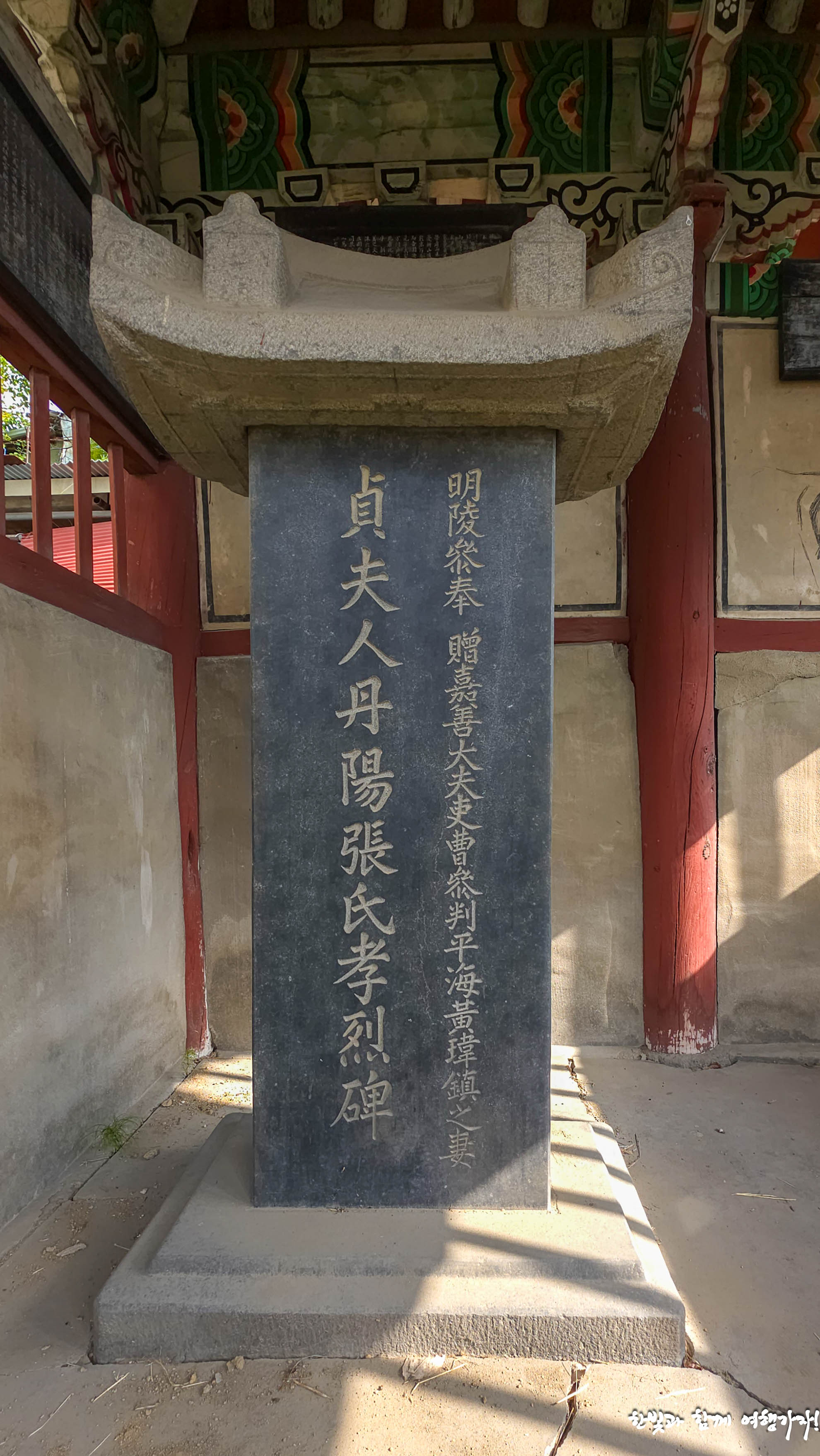 담장 안에는 홍살로 둘러싼 보호각 안에 빗돌과 정려가 있습니다. 그런데 오른쪽 홍살은 일부가 부서졌네요. 애고...