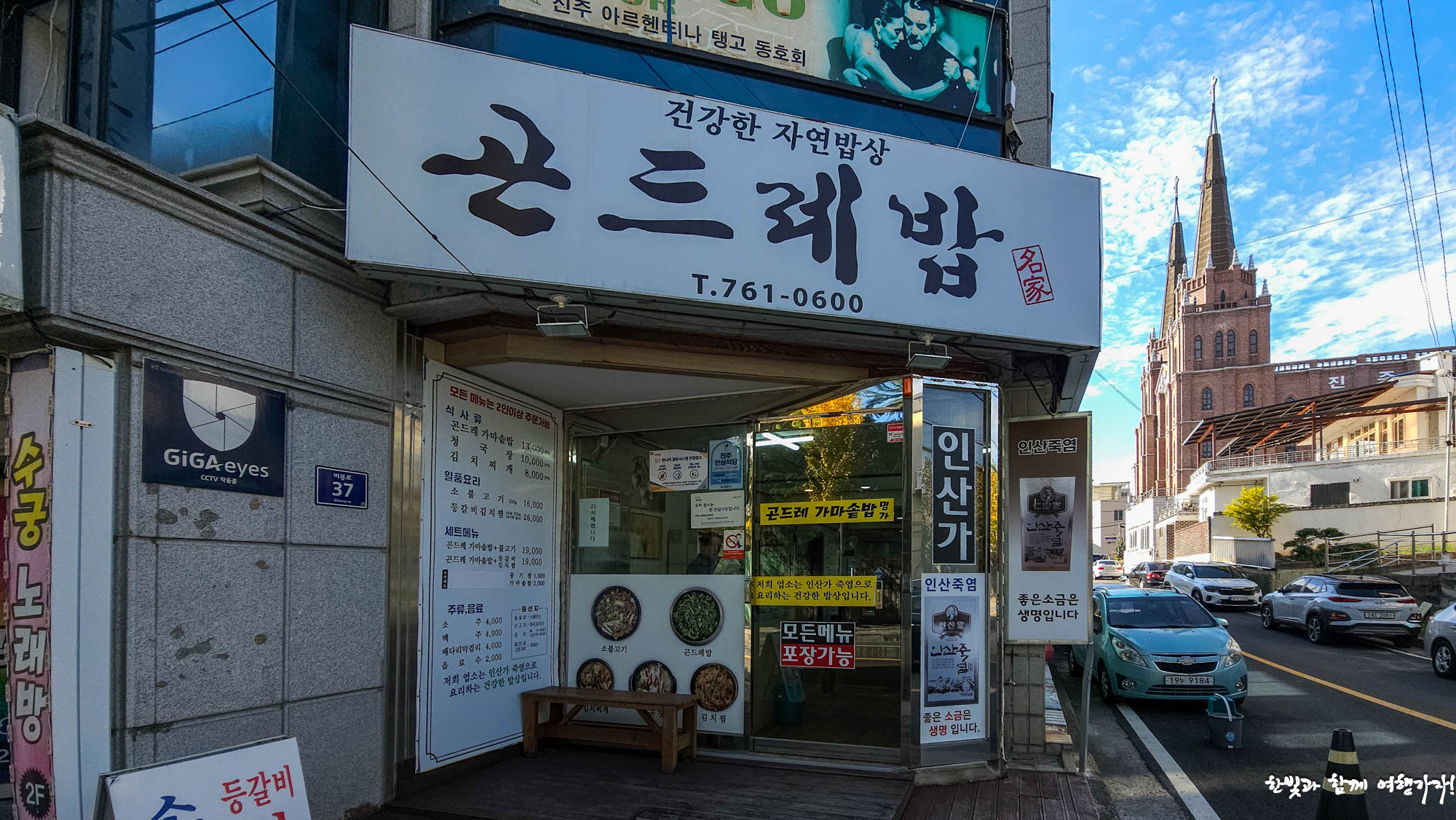 그래서 천천히 차를 타고 돌아보는 길에 우리 눈에 들어온 밥집입니다. 바로 곤드레밥집이네요. 저 뒤로 보이는 교회가 엄청 크네요. ^^