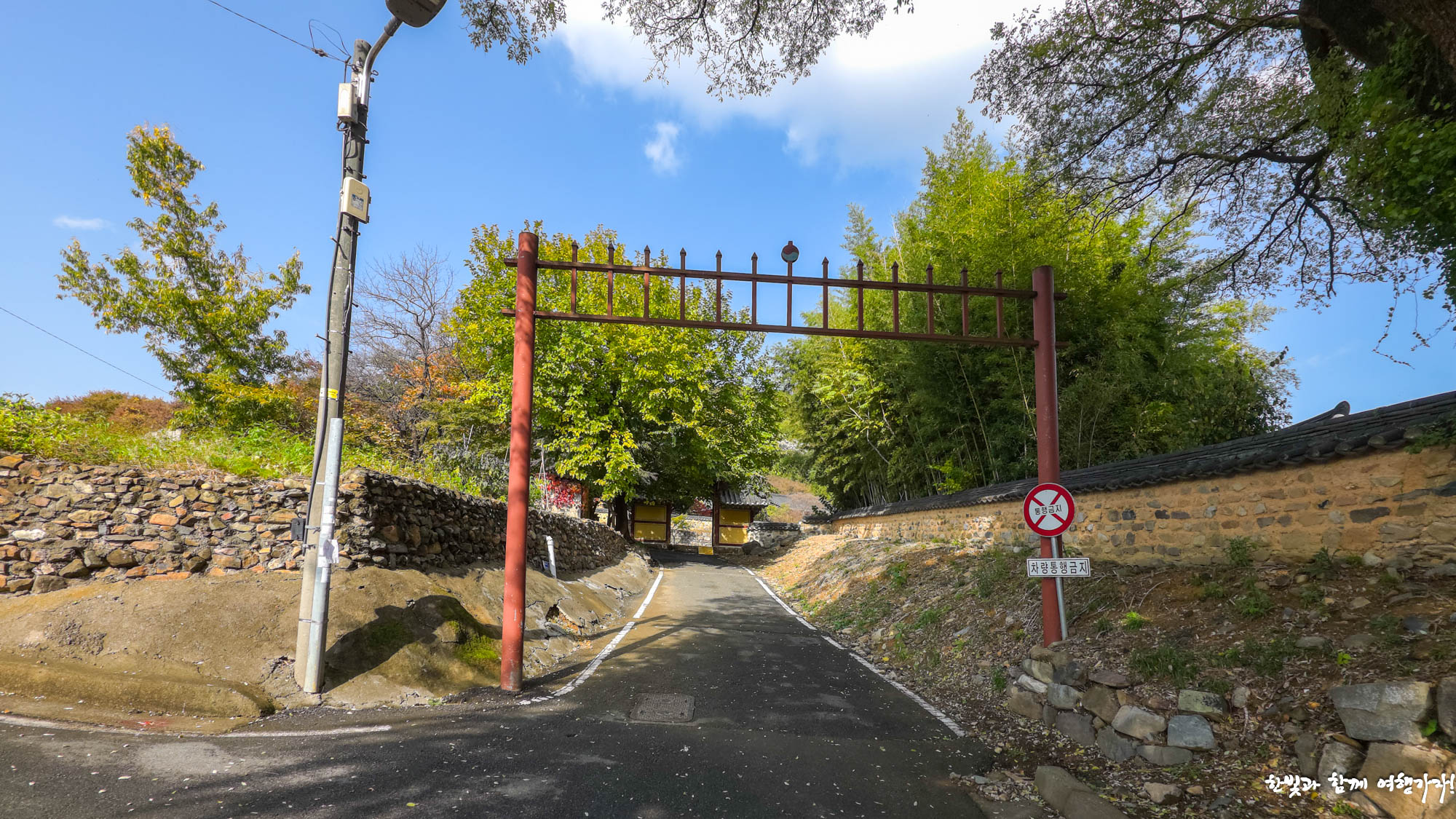 햇빛 품은 선비길, 밀양향교라 쓴 걸개막이 참 좋네요.