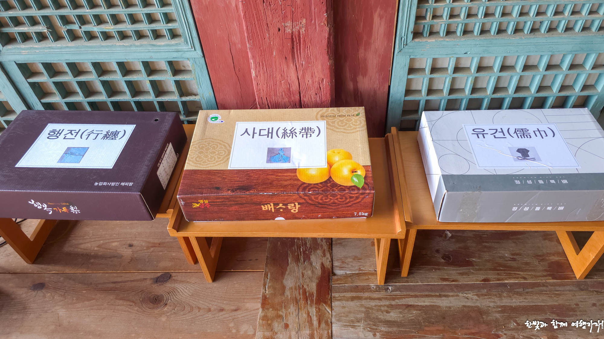 대청 한쪽에 아주 남다른 게 있습니다. 상자가 세 개 있는데, 행전, 사대, 유건이라고 쓰여 있습니다.