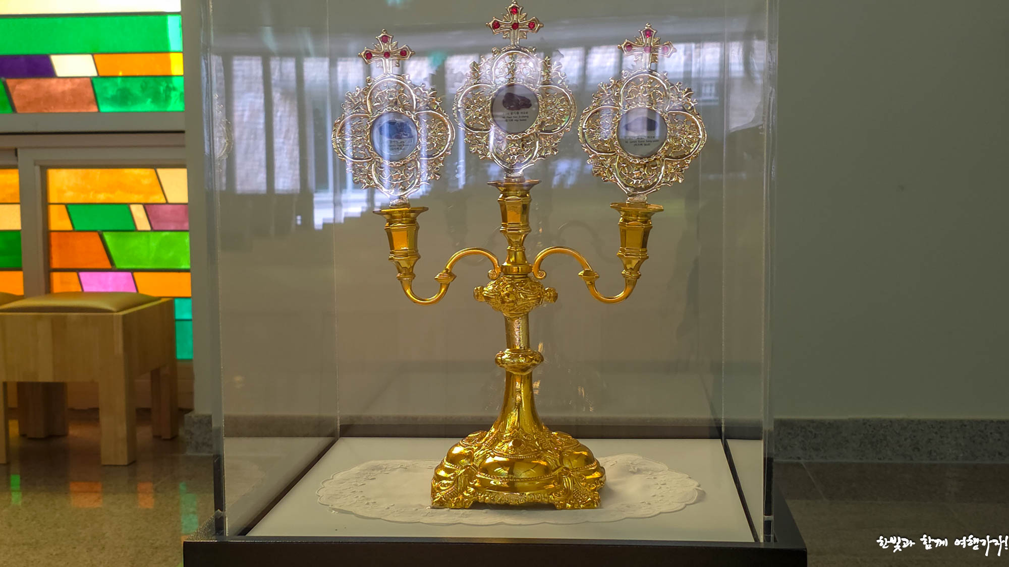 유해의 일부를 이렇게 금촛대에 각각 모셔놓은 게 무척 인상 깊습니다. 이런 풍경은 처음 봤습니다.