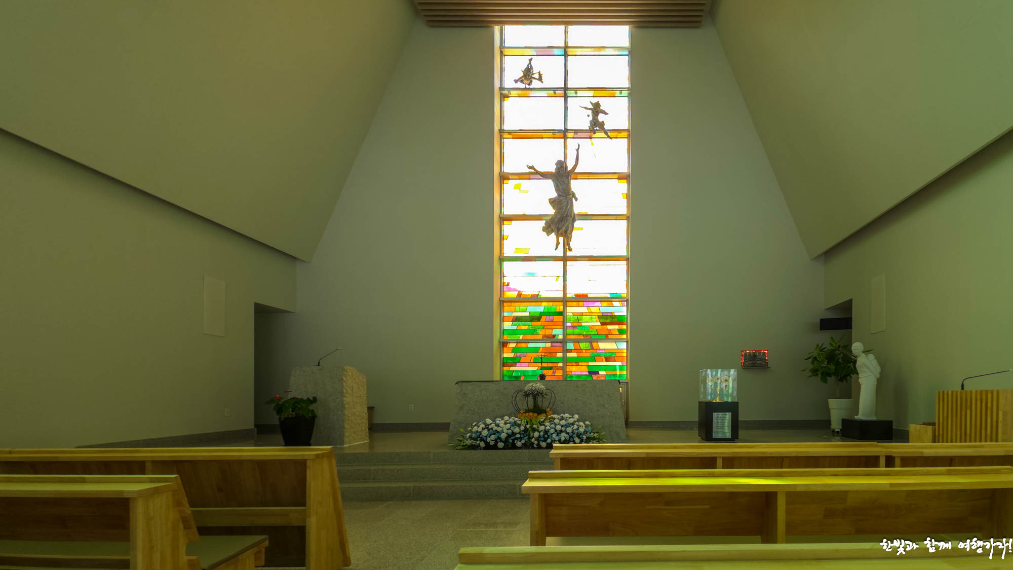 성당 안은 그리 화려하지도 않고 소박한 풍경입니다. 가장 앞에 있는 창으로 아름다운 빛이 들어오는 풍경이 매우 인상 깊습니다.