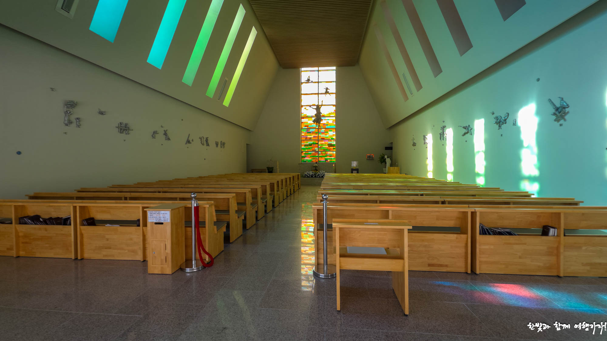 창으로 들어오는 빛이 형형색색 창에 그려진 그림과 조형물이 더욱 아름답습니다.