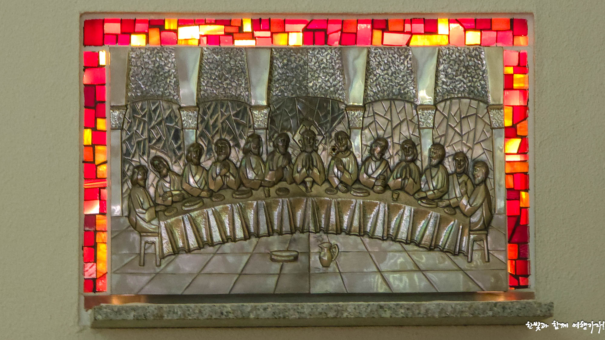 벽에는 작은 조형물들을 붙여 예수님의 '십자가의 길'을 표현한 듯하네요.