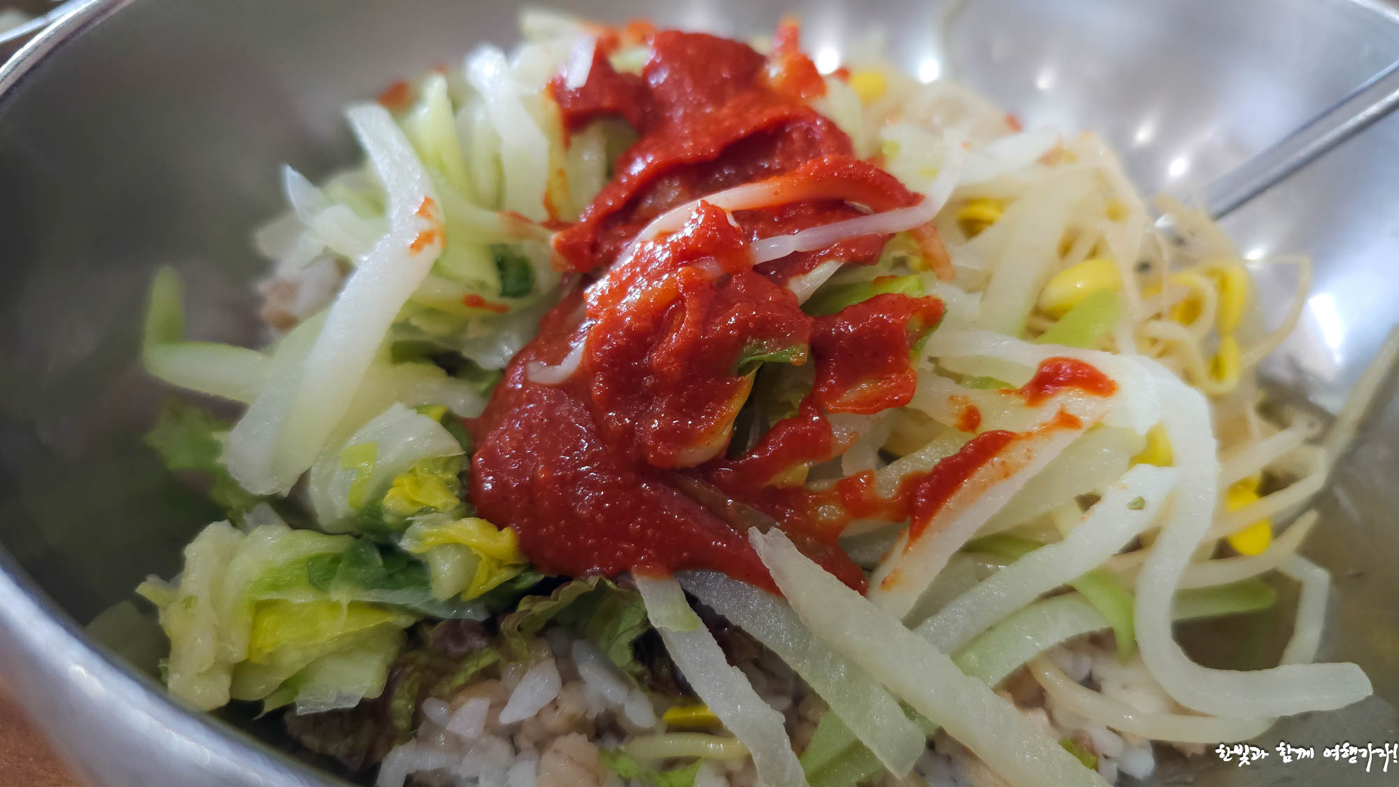 고추장도 이집에서 손수 담은 듯 보이더군요. 파는 고추장이랑 맛이 달랐어요. 담백하고 심심한 맛이라서 많이 넣고 비비니 빛깔도 살고 아주 먹음직스럽더라고요.
