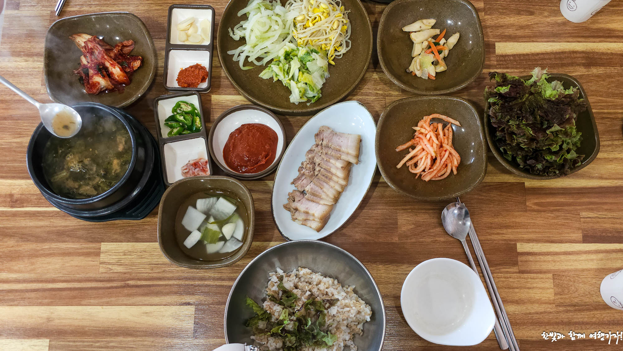 조금 기다리니 이내 상이 차려집니다. 한 상 가득 받고 보니 아주 푸짐하네요.