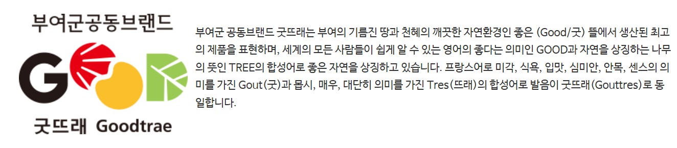 또 부여에서는 '굿뜨래'라는 부여군 공동 브랜드가 있답니다. 부여의 기름진 땅과 천혜의 깨끗한 자연환경인 좋은 뜰에서 생산된 최고의 제품을 아울러 일컫는 브랜드명이라고 하네요. 아마도 '구드래'란 지명과도 잘 어우러지는 말이니 참 좋은 이름이네요.